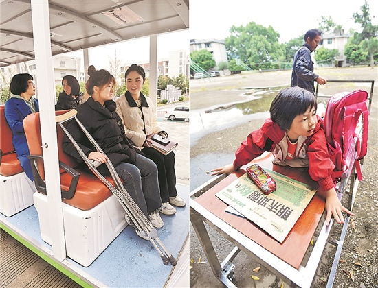 左圖為:董倩(前排左一)坐著擺渡車去飯?zhí)贸燥垼?024年3月13日攝)。右圖為:在廣西靈川縣三叉尾小學,董倩的父親董慧玲拉著床將她帶回宿舍吃飯(2012年9月13日攝)。董倩現(xiàn)在是廣西桂林師范高等??茖W校學生。出生8個月時,她摔倒導致左腿骨折,直到兩歲才被診斷為先天性成骨不全癥,又稱“瓷娃娃病”。 新華社記者 陸波岸 攝