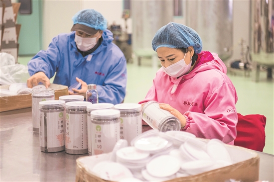 3月12日,在黑龍江省伊春樺肽生物藥業(yè)有限公司,工作人員在包裝樺樹(shù)汁相關(guān)產(chǎn)品。 被譽(yù)為“中國(guó)林都”的伊春市是全國(guó)重點(diǎn)國(guó)有林區(qū)、國(guó)家重點(diǎn)生態(tài)功能區(qū)。全面停止天然林商業(yè)性采伐后,當(dāng)?shù)匾劳辛窒聫V闊空間積極發(fā)展生態(tài)經(jīng)濟(jì),科學(xué)布局林下產(chǎn)業(yè),推動(dòng)好資源轉(zhuǎn)化為好產(chǎn)品,以多種林下特色產(chǎn)業(yè)助推轉(zhuǎn)型發(fā)展,實(shí)現(xiàn)“綠水青山”向“金山銀山”的有效轉(zhuǎn)化。