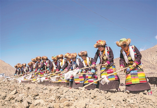 這是3月16日拍攝的西藏自治區(qū)山南市瓊結(jié)縣加麻鄉(xiāng)加麻村的春耕儀式現(xiàn)場。當(dāng)日是西藏舉行一年一度春耕大典的日子。村民身著節(jié)日盛裝,手捧“切瑪”(五谷豐登斗),唱起祈愿歌,互敬青稞酒。新華社記者 旦增尼瑪曲珠 攝