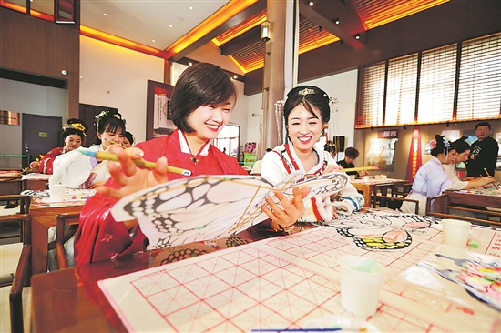 職工身穿傳統(tǒng)服飾繪制風箏 傳承歷史文化