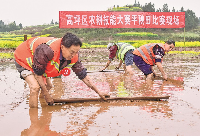 3月16日,四川省南充市高坪區(qū)幾位農(nóng)民在比賽平整秧田。當(dāng)日,高坪區(qū)在金城山糧油現(xiàn)代農(nóng)業(yè)園區(qū)會(huì)龍鎮(zhèn)熊家橋村開展農(nóng)民農(nóng)耕技能比賽,40多名種田能手和農(nóng)機(jī)手參加了平整秧田、農(nóng)機(jī)耕整農(nóng)田、手搓玉米團(tuán)3項(xiàng)比賽,一展農(nóng)耕技能。本報(bào)通訊員 邱海鷹 唐藝娟 攝