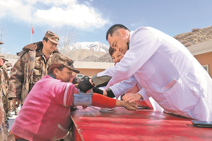 3月14日,醫(yī)療專家為護(hù)邊員測量血壓。
