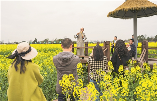 3月17日,在四川省綿陽市安州區(qū)秀水鎮(zhèn)的油菜花海中,非遺傳承人劉俗兵在表演四川金錢板,吸引游客圍觀。