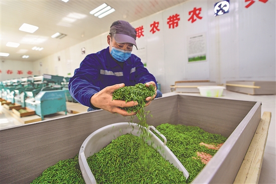 3月18日,在甘肅省隴南市文縣碧口鎮(zhèn)水蒿坪村一家茶葉加工廠,工人在篩選鮮茶葉。眼下,各地春茶陸續(xù)開(kāi)采,茶農(nóng)忙著采摘、炒制春茶,供應(yīng)市場(chǎng)。新華社記者 郎兵兵 攝
