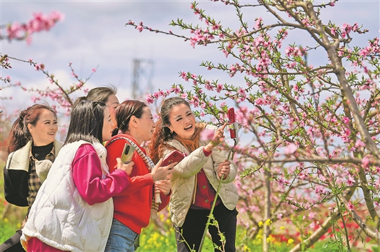 3月18日,游客在四川省南充市蓬安縣新園鄉(xiāng)寬敞溝村桃花園里賞花游玩。