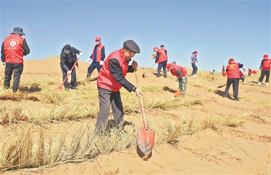 當(dāng)日,甘肅省武威市古浪縣2024年春季義務(wù)壓沙活動在騰格里沙漠南緣拉開帷幕,1700多名干部職工和群眾參加義務(wù)壓沙活動。
