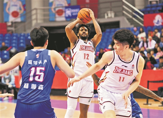 3月18日,浙江隊球員蓋利(中)在比賽中投籃。當(dāng)日,在2023~2024賽季中國男子籃球職業(yè)聯(lián)賽(CBA)常規(guī)賽第45輪比賽中,浙江隊客場106比99戰(zhàn)勝青島隊。本賽季CBA常規(guī)賽由上賽季42輪增至52輪,目前已進入爭奪季后賽名額的最后階段。新華社記者 李紫恒 攝