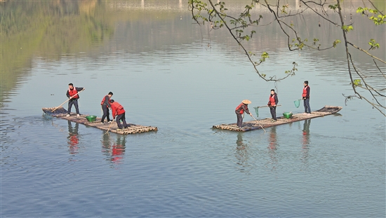 3月20日,浙江省臺州市仙居縣步路鄉(xiāng)黨員志愿者與河長一起在永安溪巡河護水,清理雜物垃圾。