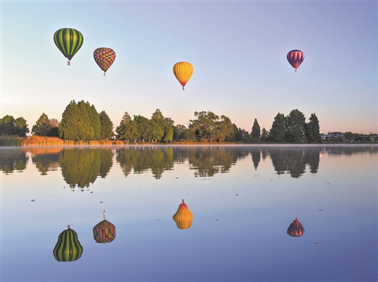 當?shù)貢r間3月20日清晨,放飛的熱氣球經(jīng)過新西蘭漢密爾頓湖上空。