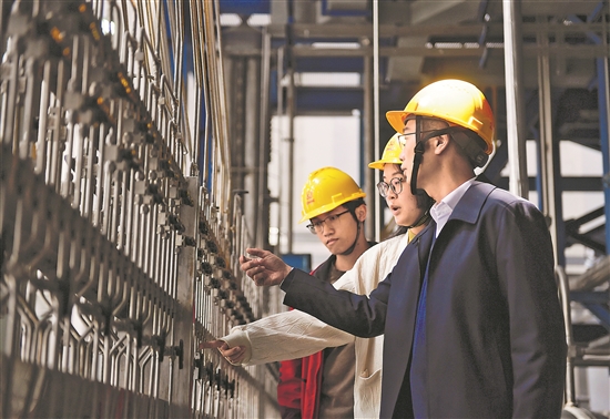 3月14日,在位于四川成都的中國核動(dòng)力研究設(shè)計(jì)院內(nèi),中核集團(tuán)“玲龍一號(hào)”總設(shè)計(jì)師宋丹戎(右一)與團(tuán)隊(duì)成員在“玲龍一號(hào)”試驗(yàn)臺(tái)架上溝通方案。