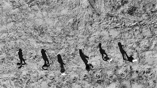 3月19日,治沙工人在白芨灘國(guó)家級(jí)自然保護(hù)區(qū)栽植檸條(無人機(jī)照片)。