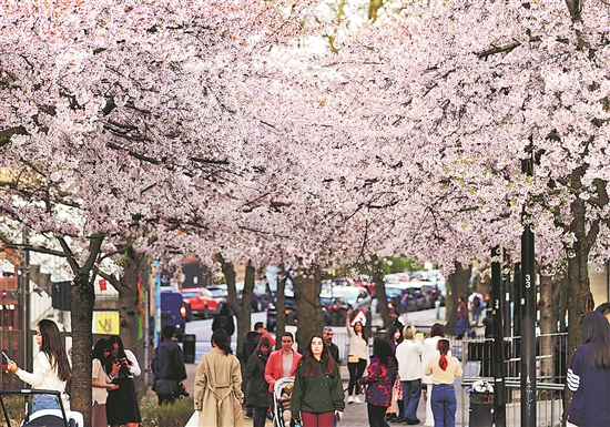 當(dāng)?shù)貢r(shí)間3月20日,在英國(guó)倫敦,人們漫步在春日的櫻花樹(shù)下。