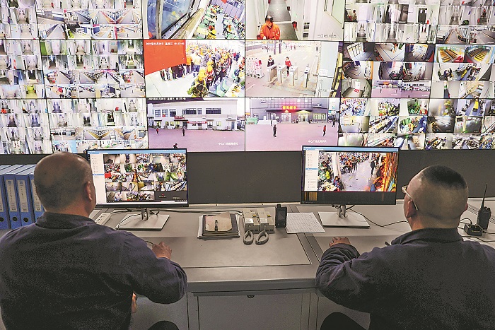 3月20日,在北京城市副中心站“建設(shè)者之家”的消防中控值機(jī)室內(nèi),兩名值機(jī)員盯著屏幕,保障工地安全。