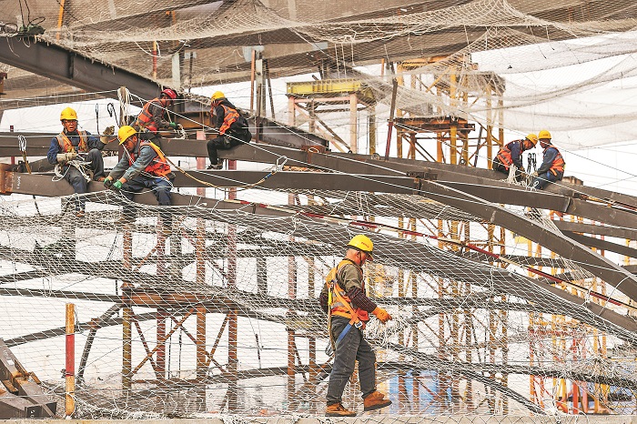 3月16日,在北京城市副中心站,工人們?yōu)榭罩械匿摻Y(jié)構(gòu)作業(yè)面鋪設(shè)防護(hù)網(wǎng),確保施工安全。