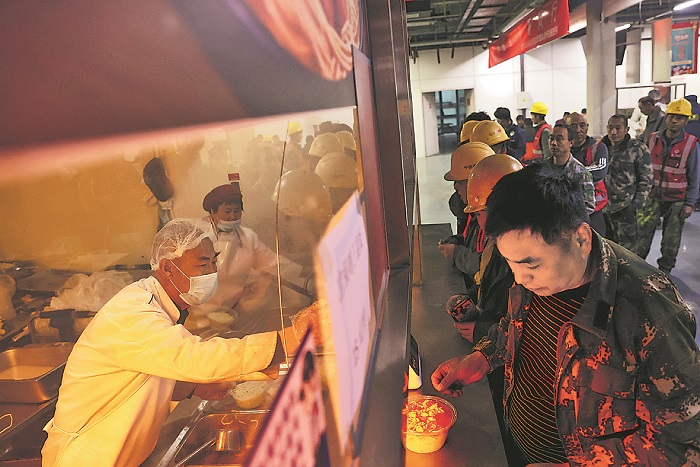 3月20日,工人有序排隊(duì)打飯,兩葷一素,10元一份。