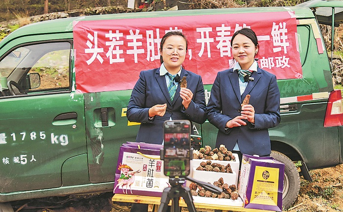 3月20日,貴州省黔西市甘棠鎮(zhèn)梨子沖村大棚基地,郵政工作人員正在直播介紹羊肚菌。本報通訊員 張晶 攝