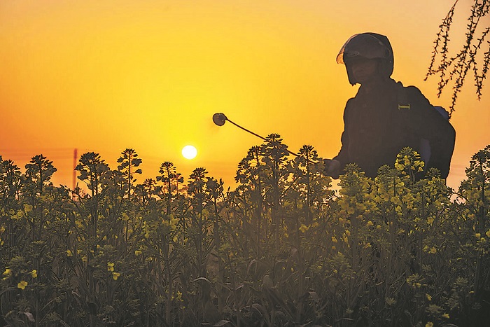 3月20日,村民在江蘇省泰州市海陵區(qū)蘇陳鎮(zhèn)院莊村油菜田間噴灑農(nóng)藥。本報通訊員 湯德宏 攝