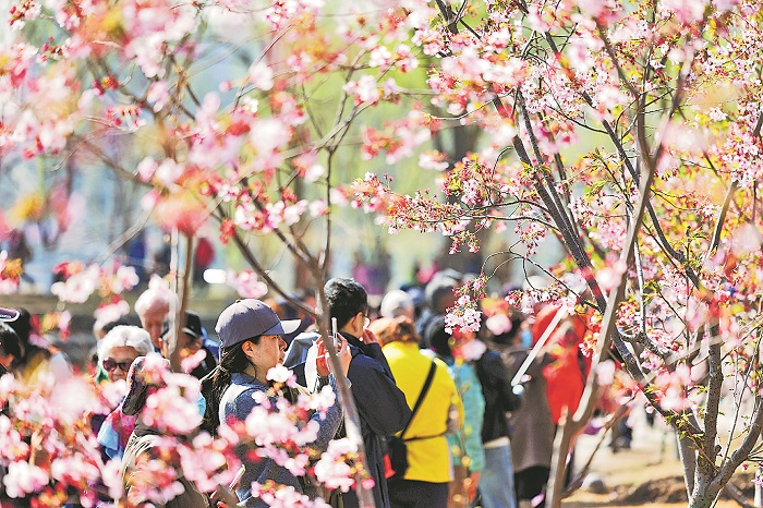 3月22日,北京玉淵潭公園,游客在打卡拍照。近日,玉淵潭公園第三十五屆櫻花文化活動暨第五屆春季花卉聯(lián)展拉開序幕。園區(qū)打造了賞特色花卉、觀特色展覽、參特色互動、享特色體驗、購特色文創(chuàng)5大板塊共10余項內(nèi)容,多維度展示公園文化。本報記者 蔚可任 攝