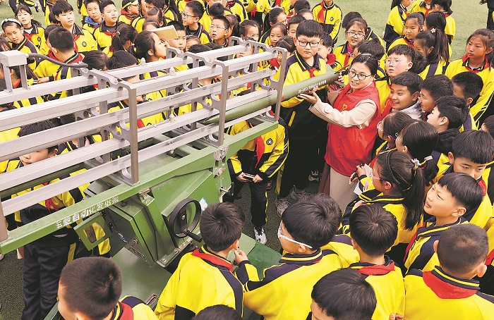3月22日,在山東省棗莊市東湖小學(xué),氣象志愿服務(wù)者在向?qū)W生們講解人工增雨防雹科普知識(shí)。