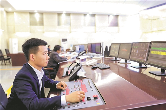 眼前這幕智能開采的場(chǎng)景,都是綜采維修電工焦飛在指揮調(diào)度控制中心內(nèi)點(diǎn)擊“一鍵啟動(dòng)”按鈕的結(jié)果。在這座全國(guó)智能化示范礦井的“中樞神經(jīng)”,身穿西裝的焦飛坐在操控臺(tái)前盯著面前的電腦屏幕,上面正實(shí)時(shí)顯示著地面和井下的設(shè)備運(yùn)行情況。