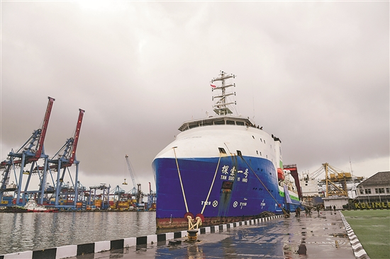 這是當(dāng)?shù)貢r間3月22日在印度尼西亞雅加達拍攝的??吭诘と植宦蹈鄣摹疤剿饕惶枴笨瓶即?。中國科學(xué)院深??茖W(xué)與工程研究所與印度尼西亞國家研究創(chuàng)新署3月23日順利完成為期一個月的爪哇海溝聯(lián)合科考。其間,兩國科研人員借助“奮斗者”號全海深載人潛水器成功下潛7178米,創(chuàng)下印尼深海下潛新紀錄。新華社記者 徐欽 攝