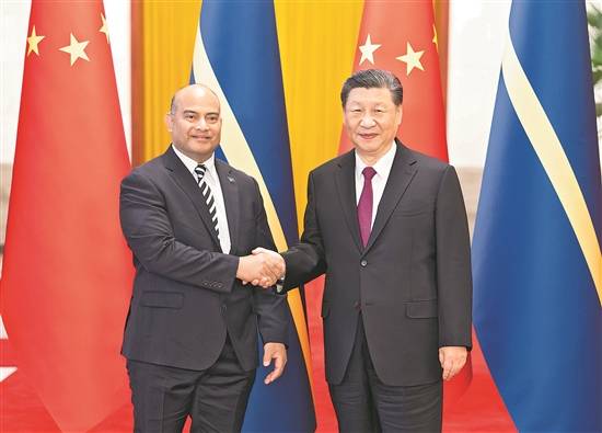 習近平指出,今年1月,瑙魯作出堅持一個中國原則、同中國復交的政治決斷,這是符合歷史大勢、順應時代潮流之舉。友好不分先后,只要開啟,就會有光明前途。合作不論大小,只要真誠,就會有豐碩成果。中瑙關系已經(jīng)翻開新的歷史篇章。中方愿同瑙方一道,開創(chuàng)中瑙關系的美好未來,更好造福兩國人民。