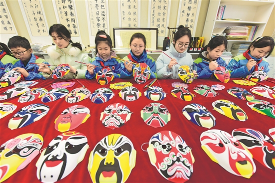 3月25日,江蘇省連云港市東??h溫泉鎮(zhèn)中心小學(xué)老師和學(xué)生繪制“京劇臉譜”。當(dāng)日,該校開展了“繪臉譜 揚(yáng)國(guó)粹”的主題活動(dòng),讓學(xué)生了解中國(guó)戲劇文化,迎接3月27日“世界戲劇日”的到來。本報(bào)通訊員 張正友 攝