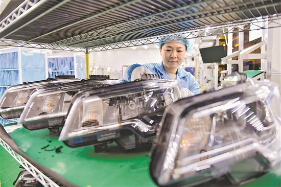 3月25日,工作人員在河北省衡水市阜城縣一家汽車配件生產(chǎn)企業(yè)的生產(chǎn)車間整理汽車前組合燈。