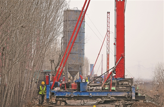 3月25日,高壓旋噴樁機在天津市靜海區(qū)臺頭北圍埝進行加固作業(yè)。