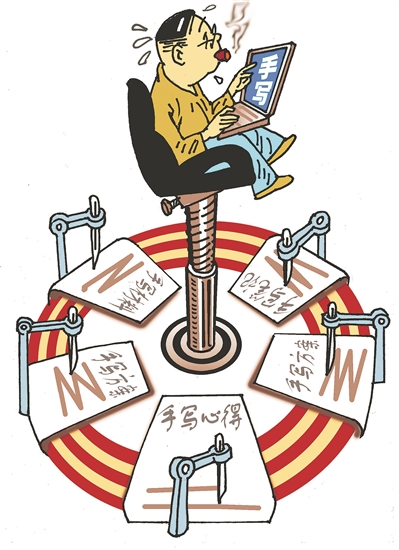 教師教案必須手寫、學(xué)習(xí)筆記必須手寫、匯報總結(jié)必須手寫……不可否認(rèn),一些部門和單位要求相關(guān)材料必須手寫,有一定的合理性,比如為促使工作人員深度思考、方便日后核驗(yàn)等,但如果類似要求過了頭,出現(xiàn)凡事都要手寫,甚至異化為“留痕”的表演工具,不僅會消耗工作人員大量的時間、精力,還會助長形式主義的不良風(fēng)氣。眼下,“寫字機(jī)器人”一些購買者的故事里難掩以科技手段變相造假、糊弄上級的用心。這事令人尷尬。