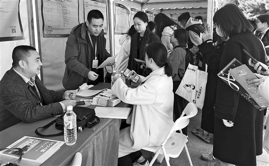 3月20日,“2024年春季綜合類專場雙選會—北京師范大學(xué)站”在北京師范大學(xué)舉行,吸引了80家用人單位參與,面向畢業(yè)生提供1000個以上招聘需求。圖為一招聘單位工作人員向?qū)W生介紹該公司業(yè)務(wù)和崗位需求。 本報記者 于忠寧 攝