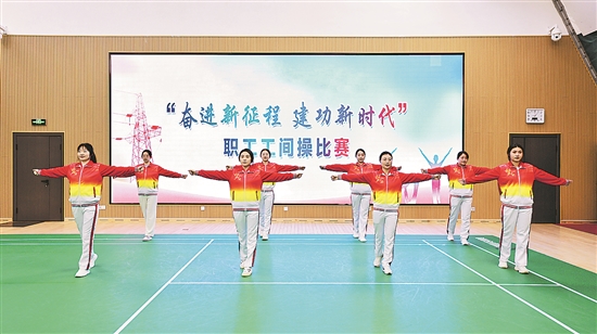 為提高全民健身意識(shí),強(qiáng)健員工身體素質(zhì),國(guó)網(wǎng)松原供電公司堅(jiān)持以人為本、因地制宜、員工受益的原則,依托活動(dòng)中心、職工小家等場(chǎng)所,定期開(kāi)展籃球、羽毛球、工間操等健身活動(dòng),在企業(yè)掀起了全民健身熱潮,營(yíng)造了以關(guān)愛(ài)員工健康促進(jìn)企業(yè)和諧發(fā)展的良好氛圍。圖為近日該公司員工工間操比賽現(xiàn)場(chǎng)。(張文琦 攝)
