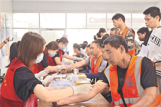 當(dāng)日,項目部邀請回龍鎮(zhèn)醫(yī)院體檢中心開展現(xiàn)場健康體檢,重點檢查農(nóng)民工職業(yè)病患病情況,有針對性地對施工一線易患疾病進行預(yù)防,切實將關(guān)愛農(nóng)民工工作抓細抓實。