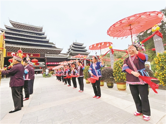 在廣西柳州三江縣林西鎮(zhèn)平巖村,當(dāng)?shù)卮迕裢ㄟ^在程陽(yáng)八寨景區(qū)表演侗族特色歌舞成功實(shí)現(xiàn)就業(yè)。