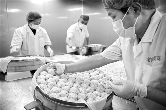 3月24日,浙江省海寧市長安鎮(zhèn)的一處“共富工坊”內(nèi),工人正在車間內(nèi)制作當(dāng)?shù)胤沁z小吃——長安宴球。該小吃在當(dāng)?shù)貜V受歡迎且純手工制作,用工需求量大。截至目前,“共富工坊”已吸納興福村周邊近30名村民靈活就業(yè),其中低收入農(nóng)戶兩人,提供本地務(wù)工100人次,帶動(dòng)30多戶村民增收。本報(bào)記者 王偉偉 攝