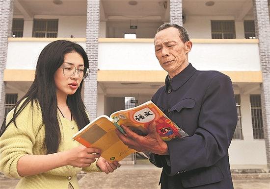 3月27日,在廣西灌陽縣洞井瑤族鄉(xiāng)野豬殿小學(xué),趙艷(左)和李祖清探討教學(xué)問題。