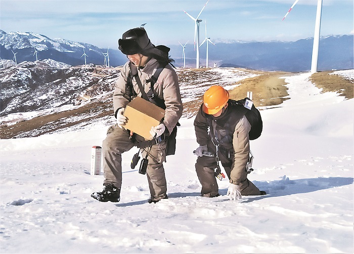 3月14日,在海拔4000米左右的龍源電力雪邦山風電場,風機附近積雪深處還有1米左右。運維班組職工攜帶約40公斤的檢修工具包和風機備件,徒步5公里進行檢修作業(yè)。