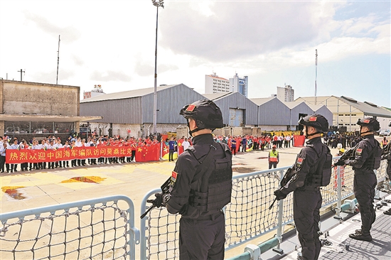 中國海軍第45批護航編隊當?shù)貢r間4月1日按計劃抵達莫桑比克馬普托港,開始為期5天的友好訪問。圖為中國海軍第45批護航編隊在莫桑比克馬普托港受到熱烈歡迎。