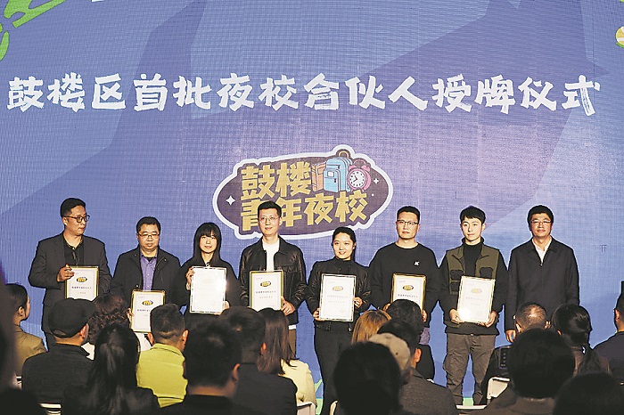 3月29日,南京鼓樓區(qū)首批夜校合伙人授牌儀式舉行,石遠宇(右二)上臺接受授牌。