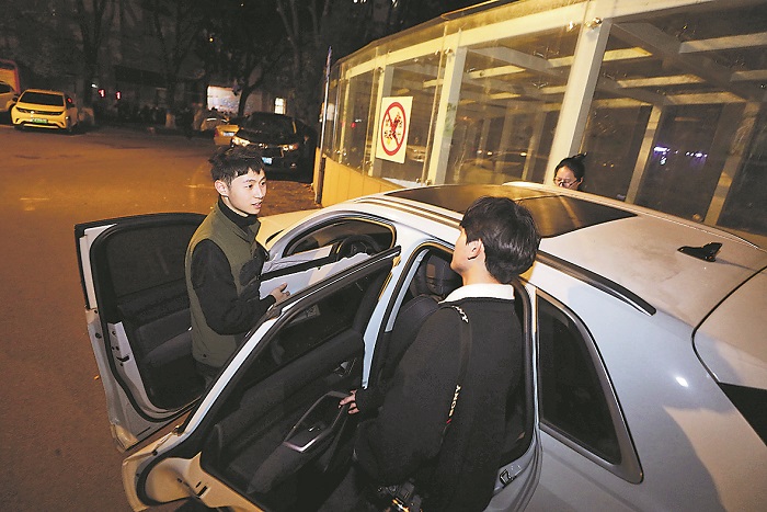 3月28日晚,南京市鼓樓區(qū)華陽佳園社區(qū)黨群服務(wù)中心,石遠宇(左一)和老師們下課后一起回家。