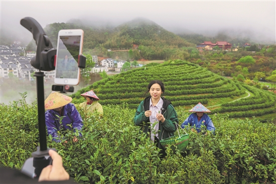 4月7日,在金華山鹿田村的婺州舉巖茶基地,工作人員直播介紹婺州舉巖茶。