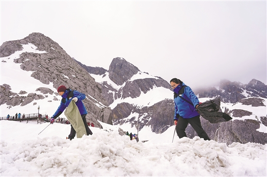 麗江玉龍旅游股份有限公司索道經(jīng)營分公司景區(qū)部環(huán)衛(wèi)三組組員和德軍(左)與同事和興蘭在雪地上清理垃圾。