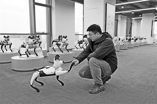 圖為蔚藍(lán)科技工作人員正在和BabyAlpha機(jī)器狗互動(dòng)。本報(bào)記者 劉金夢(mèng) 攝