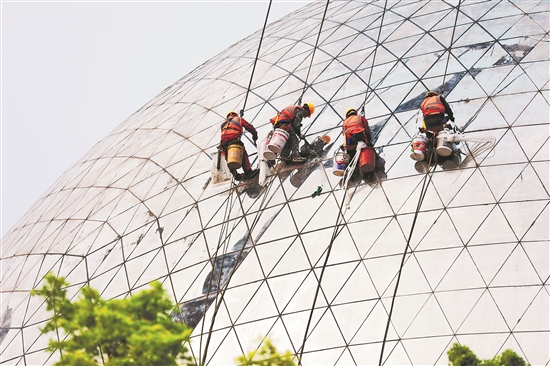 4月4日,北京的一處圓形建筑上,“蜘蛛人”正在外立面作業(yè)。在高樓聳立的大都市,有一群人,手持各式工具在數(shù)十米高的建筑外立面施工作業(yè),他們中有清潔工、維修工、建筑工等,被形象地稱為城市里的“蜘蛛人”。近年來,各類玻璃幕墻廣泛應用于建筑外立面,這些“蜘蛛人”隊伍也日益多了起來,他們的分工也越發(fā)明細。清潔、維修、更換廣告牌、玻璃安裝……他們在用雙手創(chuàng)造自己幸福生活的同時,也裝扮著城市容顏。本報記者 王偉偉 攝