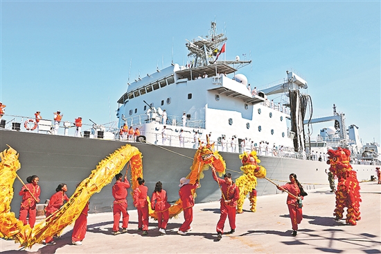 中國海軍第45批護航編隊日前抵達馬達加斯加圖阿馬西納港,開始為期5天的友好訪問。圖為中國海軍第45批護航編隊抵達圖阿馬西納港,歡迎儀式上馬方組織舞龍、舞獅表演。