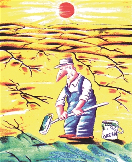 弄虛作假處處皆見(jiàn)。為了讓大地一片“青翠”,當(dāng)政者雇人在荒野上涂刷綠漆,其成本不低于掘井挖渠。此拙劣手法可休矣!