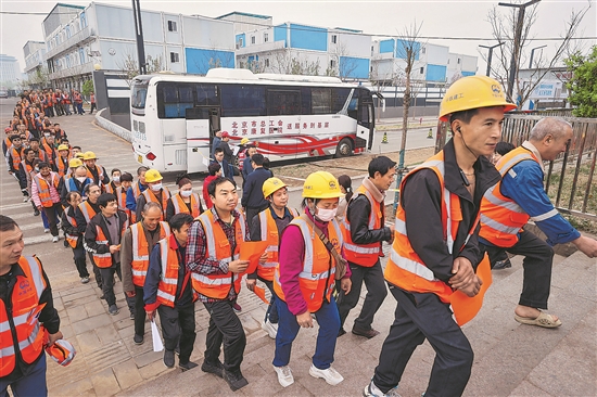 4月12日,在北京城市副中心綜合交通樞紐建設項目,工人們正在排隊進行免費體檢。此次免費公益健康體檢主要針對此建設項目的特種行業(yè)職工和女職工,共有6家參建單位的900多名職工參加了體檢。本報記者 吳凡 攝