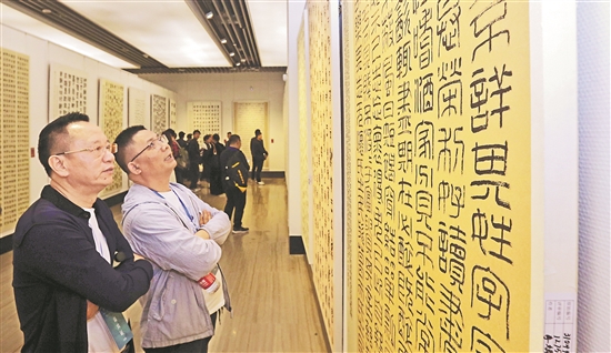 作為第四十屆蘭亭書(shū)法節(jié)的一項(xiàng)重頭活動(dòng),全國(guó)第十三屆書(shū)法篆刻展覽(浙江展區(qū))在浙江紹興蘭亭書(shū)法博物館開(kāi)展。該展覽是中國(guó)書(shū)法界最高規(guī)格的全國(guó)性綜合展覽,每四年舉辦一屆。共有965件作品入展,按書(shū)體分三個(gè)展區(qū)展覽。浙江(紹興)作為其中的“篆書(shū)篆刻刻字”展區(qū),此次共展全國(guó)各地優(yōu)秀篆書(shū)作品88件、篆刻作品76件、刻字作品33件。梁永鋒 攝/中新社