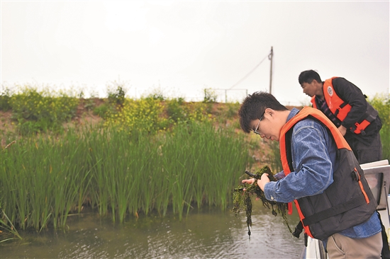 4月11日,李楊(前)在大通湖查看水草的生長情況。