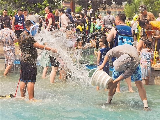 當(dāng)日,云南省西雙版納傣族自治州舉行潑水狂歡活動,人們歡聚在景洪市潑水廣場,用相互潑水的方式互送祝福,慶祝潑水節(jié)。新華社記者 董博懷 攝